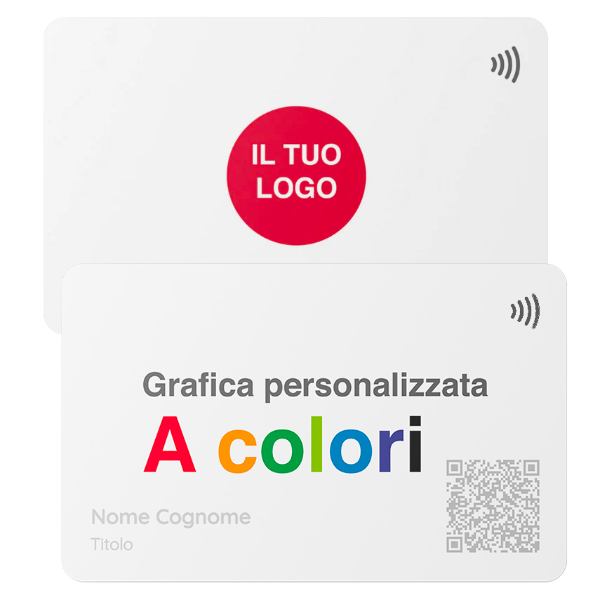 Card in PVC ad alta resistenza, con tecnologia NFC integrata e stampa personalizzata fronte e retro, a colori.